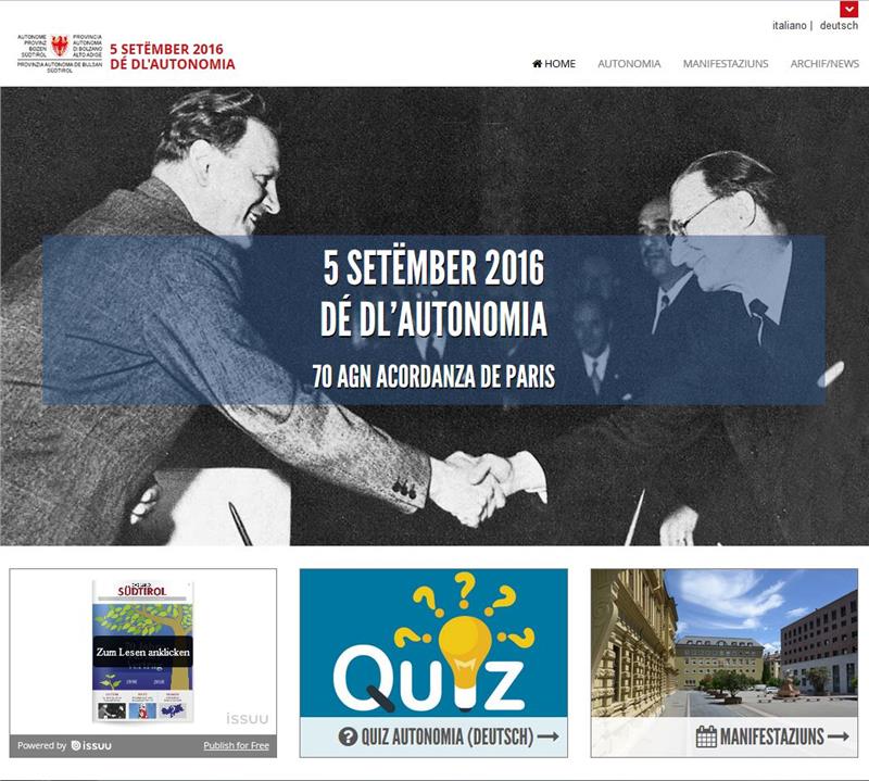 La plata web dedicada al De dl’Autonomia, elaborada dal Ofize stampa dla Provinzia en colaboraziun cun l’Informatica Südtirol, pita na panormanica sön les manifestaziuns dedicades aposta al aniversar y tla seziun autonomia él da ciafé na seria de informaziuns de basa sön le percurs storich dala firma tl ann 1946 cina aldedaincö. A desposziun él ince la revista speziala dl „Land Südtirol“ che ti é propi gnü dedicada ai 70 agn dl’Acordanza de Paris.