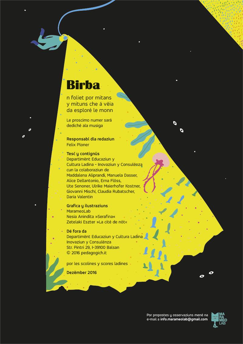 La redaziun dl sföi nü ti á dé ince na gran importanza ala creaziun dl layout plü adaté al’eté, chësc ince por le fat che mituns é aldedaincö oticamënter y stilisticamënter bele ausá a standards scialdi alc. Por ci che reverda le conzet formal dla revista, incontunse chiló laite n livel de complessité che corespogn avisa ales capazités rezetives de n publich danter 8 y 12 agn. Le responsabl dla redaziun dl sföi „Birba 2“ é le diretur dl Ciamp Inovaziun y Consulënza Felix Ploner, i tesć y contignüs é gnüs realisá dal Departimënt Educaziun y Cultura Ladina en colaboraziun cun Maddalena Aliprandi, Manuela Dasser, Alice Dellantonio, Erna Flöss, Ute Senoner, Ulrike Maierhofer Kostner, Giovanni Mischí, Claudia Rubatscher y Daria Valentin. La grafica y les ilustraziuns é na produziun de „MarameoLab“, Nesia Anindita „Serafina“ y Zetelaki Eszter „La cité de nöz“.