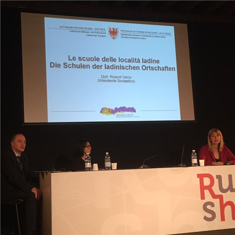 L diretëur dl ARLEF (Ajenzia per l lingaz furlan) William Cisilino à ulù nvië te chësta ucajon l Intendënt Ladin a prejenté la bona pratiches de na scola paritetica y plurilinguela tl raion ladin che possa festejé chëst’ ann i 70 ani dala istituzion dl 1948. Te si referat à Roland Verra purtà dant la fundamëntes giuridiches y pedagogiches dl model scolastich ladin, metan man cun la esperienzes plurilingueles tla scolina y ruvan ala alfabetisazion trilinguela tla prima tlass dla scola elementera, per jì ite depona plu avisa sun l funzionamënt dl model paritetich a uni livel de educazion.