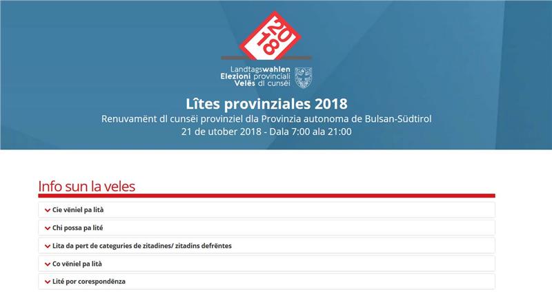 Ai 21 d'otober dl 2018 él les lites provinziales 2018 por renové le Consëi provinzial, y intratan á bele metü man l'organisaziun. Chisc dis á l’Ofize Afars istituzionai dla Provinzia metü online en colaboraziun cun l’Informatica Alto Adige le portal web dles lites provinziales 2018. Sön le sit http://lites.provinzia.bz.it él n valgönes novités respet al passé: imprömadedöt n logo nü (blanch, cöce y lominus bröm) y na grafica che costituësc ince la coporate identity nöia por i materiai litai. N'atra novité é la verjiun por inglej dles informaziuns por alisiré la comprenjiun da pert di zitadins foresti. Dlungia les informaziuns prinzipales (por ci che an lita, che che pó lité, sciöche an lita) él ince na seziun cun les domandes che vëgn fates plü sovënz olache an pó interagí cun l’aministraziun y ciafé na resposta.