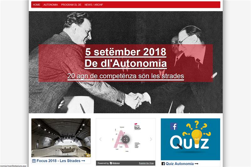 Sön le sit, renové y ajorné respet al'ediziun dl 2017, él na pert storica sön l'autonomia, cun lapró na timeline che mostra sö les carateristiches y i passaji plü importanc por le Südtirol. Na gran lerch ti vëgn dada al program detaié dl de dl'autonomia, y dantadöt ai 20 agn de competënza dla Provinzia sön les strades. A pert döes mostres sön la Plaza Silvius Magnago y tl Palaz Widmann, por descurí n valgönes curiosités sön döt ci che reverda la rëi stradala "made in Südtirol", pón porvé fora le livel de preparaziun tres n quiz sön la plata Facebook ofiziala dla Provinzia de Balsan. Che che arjunj le majer numer ará la poscibilité da gní a se dô na picia scincunda en ocajiun dl de dl'autonomia tla Plaza Silvius Magnago.