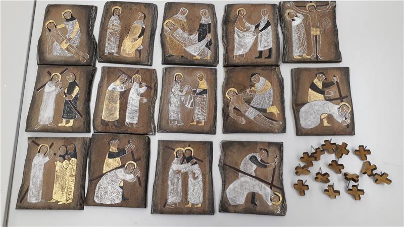 Pro les operes artistiches se tratel de 14 relief de lëgn che rapresentëia les 14 staziuns dla Via Crucis che ti é gnüdes scincades al ospedal dal’artista de Gherdëna Mili Schmalzl (*1912 +2006). Les operes é ince gnüdes premiades tl ann 1960 tratan la “Deutsche Handwerksmesse” dal guern regional dl Paiern. Cun le passé dl tëmp s’á les operes danejé y insciö jol debojëgn de na restauraziun dles operes. Le laur artistich é gnü fat da indöt 9 scolares y scolars dla Cademia sot ala suravijiun dl professur Diego Deiana.