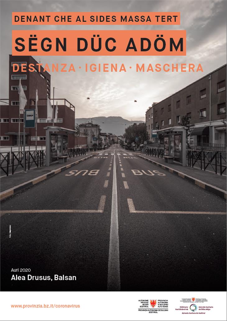 La campagna de comunicaziun orüda dala Junta provinziala en colaboraziun cun l’Aziënda sanitara é piada ia. Le messaje prinzipal é chël da ponsé do sön les conseguënzes che le Covid-19 á sön la vita da vigni de y sön l’importanza da respeté les püces regoles tleres dades dant. Por la campagna él gnü chirí fora fotografies fates tratan le lockdown tl Südtirol y le messaje é tler: düc dess tigní adöm y respeté les regoles a na manira che an ne röies nia plü tla situaziun sciöche da d’aisciöda dl 2020. Al vëgn insciö damané da respeté les regoles che reverda la destanza danter les porsones, l’igiena dles mans y l’oblianza da adoré la maschera por curí bocia y nes.